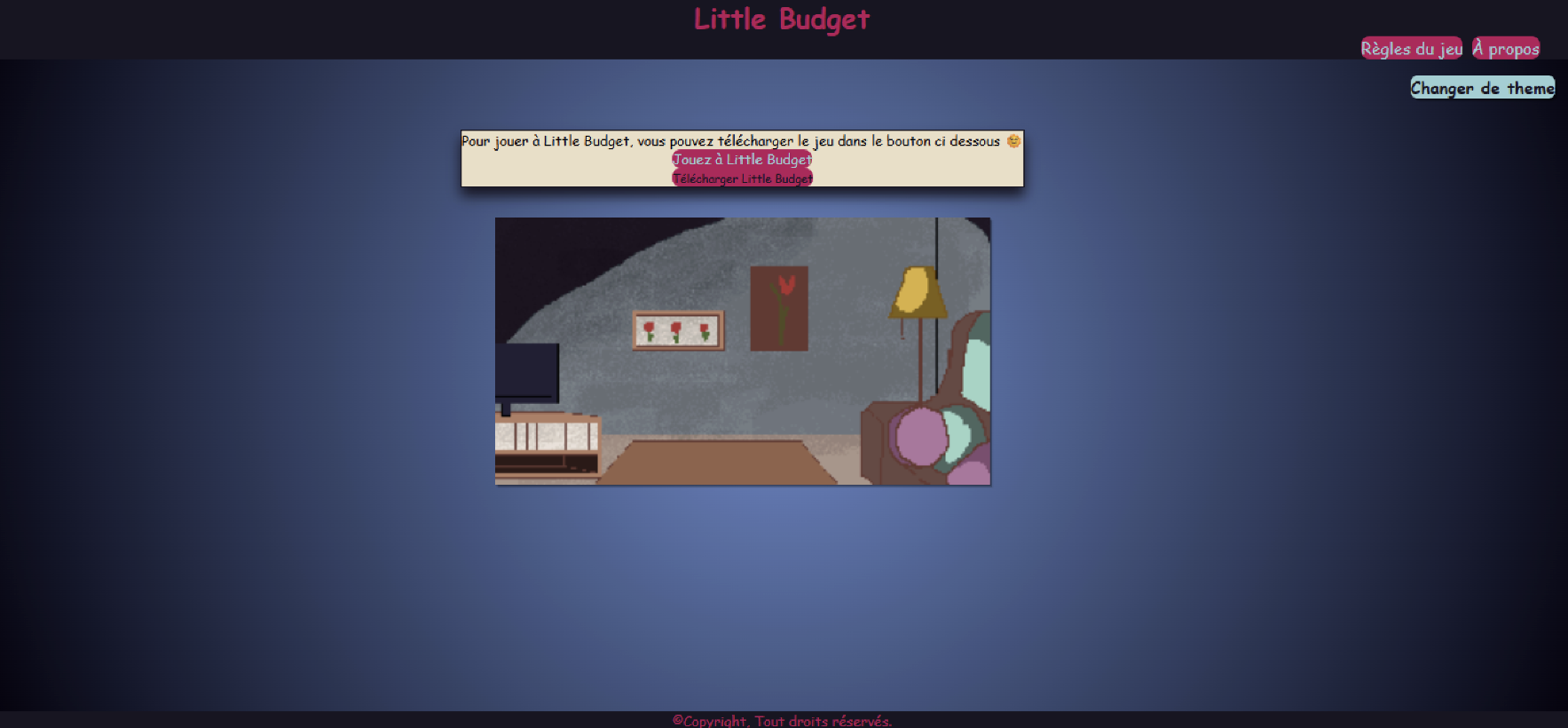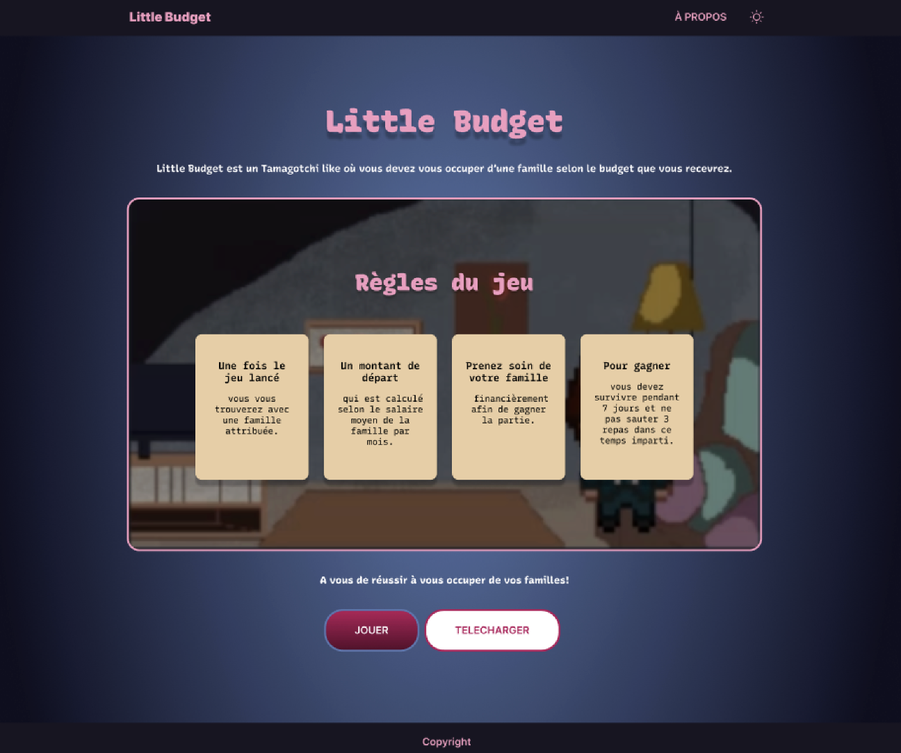 Little Budget is a project created during a 3-day finance-themed hackathon. It consists of a website and a game. The game contains a series of events that impact the player's budget based on their choices. The objective is to survive until the end without losing all your money